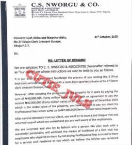 “After securing the property for two years by paying ₦40,000,000 upfront with an agreement to pay another ₦40,000,000 by the end of December 2025, you have refused to pay our client his professional fees of ₦7,000,000. After several demands, you went on to issue a dud cheque that was returned unpaid.”