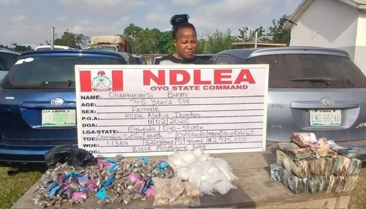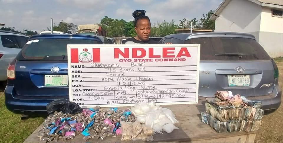 In Ibadan, Oyo State, a 45-year-old woman was arrested with synthetic cannabis, methamphetamine, nearly ₦3 million in cash, and two vehicles.