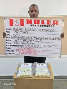 At the Nnamdi Azikiwe International Airport, Abuja, NDLEA officers arrested a 34-year-old China-based Nigerian businessman, Ibeanu Vincent Chukwudulue, on February 4, 2026, while boarding Qatar Airways flight QR1432 to China via Doha. A body scan confirmed ingestion of illicit drugs. He was placed under observation and subsequently excreted 52 pellets of cocaine weighing 735.95 grams.