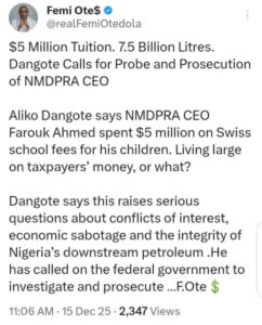“Aliko Dangote says NMDPRA CEO Farouk Ahmed spent $5 million on Swiss school fees for his children. Living large on taxpayers’ money or what?” Otedola wrote. “He has called on the Federal Government to investigate and prosecute.”