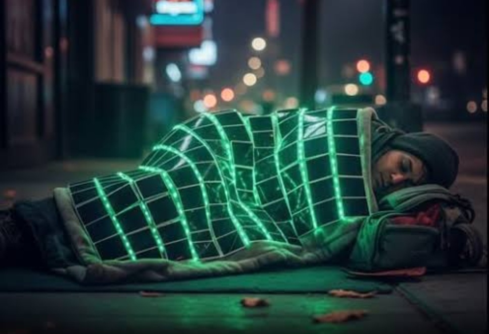 The innovative blanket uses lightweight solar panels to collect and store energy during the day, which is then released as heat when temperatures fall at night. The design is intended to work without fuel or external electricity, making it practical for outdoor use and emergency situations.