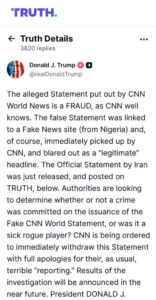 Reacting to a statement attributed to Iran, Trump dismissed the report, insisting it was fabricated. He alleged that the statement broadcast by CNN did not reflect Iran’s official position and was instead picked up from what he described as a “fake news site” originating from Nigeria.
